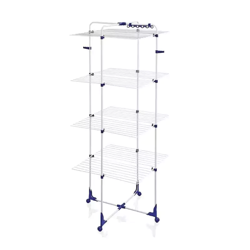 The base part is designed in such a way that both single and double poll 3 layers are constructed in 1 base design. The tray part is designed in such a manner that all tray pipes are inserted uniformly & designed to dry clothes quickly and easily without affecting other clothes on it. So there is enough space between the clothes & they can dry quickly. Top extension provides an additional feature of drying long clothes such as bed sheets, Towels & sarees. It has short & long-height pipes at the same layer; one side pipe has a bigger height than the pipe on the opposite side.